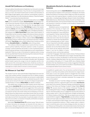 Mendelsohn Elected to Academy of Arts and Sciences Award-winning author and critic Daniel Mendelsohn has been elected a member of the American Academy of Arts and Sciences. Mendelsohn, the Charles Ranlett Flint Professor of Humanities at Bard College since 2006, this year joins the ranks of the most respected figures in academia, the arts, business, and public affairs—including George Washington, Benjamin Franklin, Daniel Webster, Ralph Waldo Emerson, Albert Einstein, Winston Churchill, Leon Botstein, more than 250 Nobel laureates, and more than 60 Pulitzer Prize winners. Mendelsohn was inducted at a ceremony on October 6 at the Academy’s headquarters in Cambridge, Massachusetts. Mendelsohn was born on Long Island and educated at the University of Virginia and Princeton University. Since 1991 his essays and reviews have appeared in many publications, most frequently in The New Yorker and The New York Review of Books. He has also been the weekly book critic for New York and a frequent contributor to The New York Times Book Review, and is a contributing editor at Travel + Leisure. The Lost: A Search for Six of Six Million, published by HarperCollins in 2006, is an international bestseller and won the National Book Critics Circle Award and the National Jewish Book Daniel Mendelsohn photo Matt Mendelsohn Award. It won the Prix Médicis in France, among other honors, and has been published in more than 15 languages. Other books include a memoir, The Elusive Embrace (1999), a New York Times Notable Book and Los Angeles Times Best Book of the Year; a collection of reviews, How Beautiful It Is and How Easily It Can Be Broken (2008), a Publishers Weekly Best Book of the Year; and an acclaimed two-volume translation of the poetry of C. P. Cavafy (2009), also a Publishers Weekly Best Book of the Year. Mendelsohn’s honors include a Guggenheim Fellowship, the National Book Critics Circle Citation for Excellence in Book Reviewing, and the George Jean Nathan Prize for Drama Criticism. its capability for a greater justice. Yes, war becomes a sacrifice for those who partake in it, but those who partake sacrifice themselves for a larger humanitarian peace. It turns into a greater injustice to disregard the fruits of their accomplishment by deeming their methods as amoral.” A question-and-answer session followed, and those in attendance applauded “the courage and eloquence of the speakers.” The debate was part of “Just War in Religion and Politics,” a West Point– Bard Exchange conference, organized by Bard Center Fellow Jacob Neusner, senior fellow at the Institute of Advanced Theology and Distinguished Service Professor of the History and Theology of Judaism; College Chaplain Bruce D. Chilton ’71, executive director of the Institute of Advanced Theology and Bernard Iddings Bell Professor of Religion; Jonathan Becker, vice president and dean for international affairs and civic engagement and associate professor of political studies; and R. E. Tully of the departments of English and philosophy, U.S. Military Academy at West Point. “War, like any deeply human activity, will exceed all efforts to regulate it,” Roger Berkowitz, associate professor of political studies and human rights and academic director of the Hannah Arendt Center for Politics and Humanities at Bard College, wrote in the introduction to the book that accompanied the conference. “What is needed, rather, is a determination to recall that justice, and not merely strategy and utility, has a place in war. What just war thinking offers is the insistent determination that those who fight not blind themselves to the illumination of justice amidst the fog of war.”