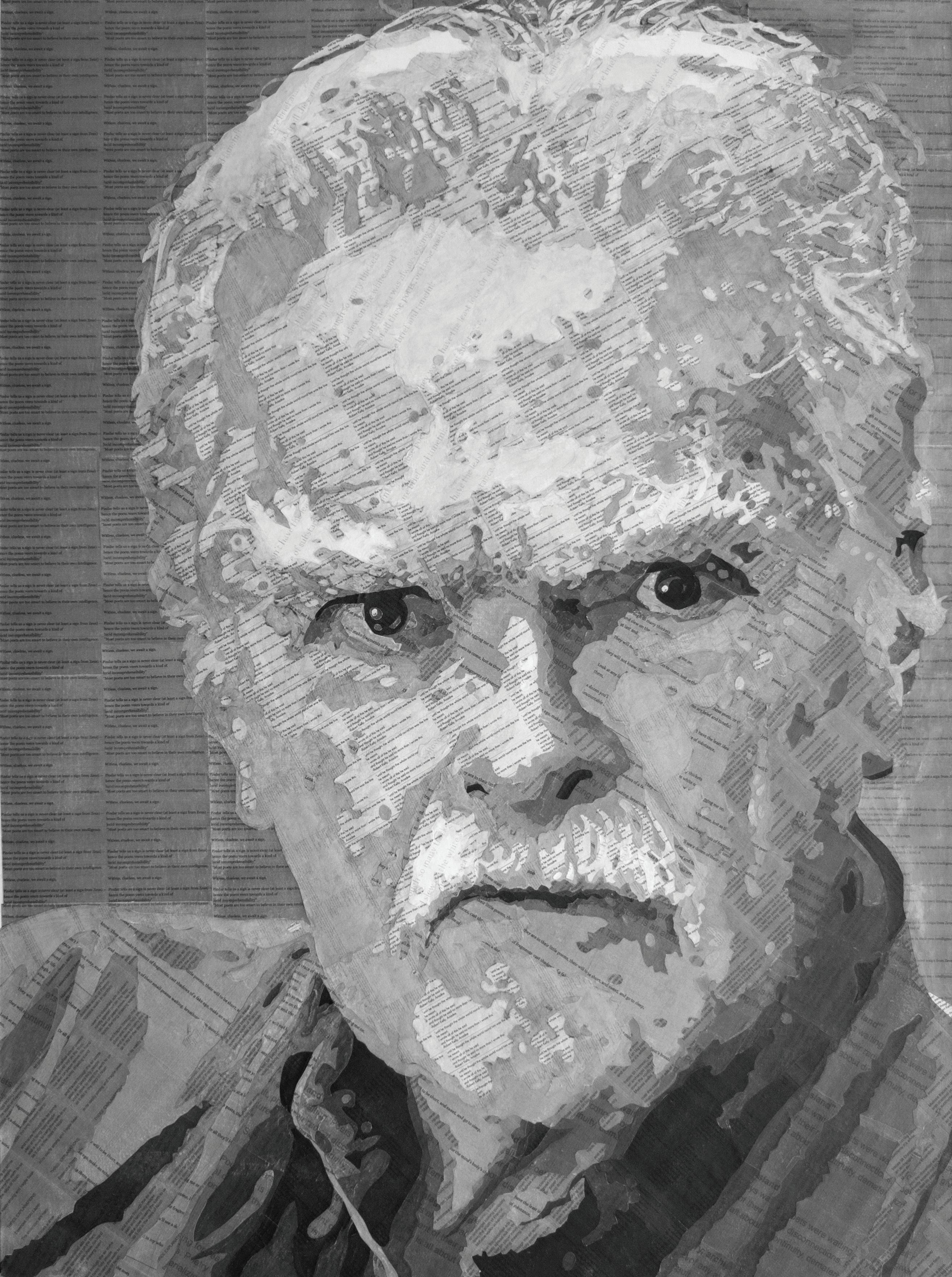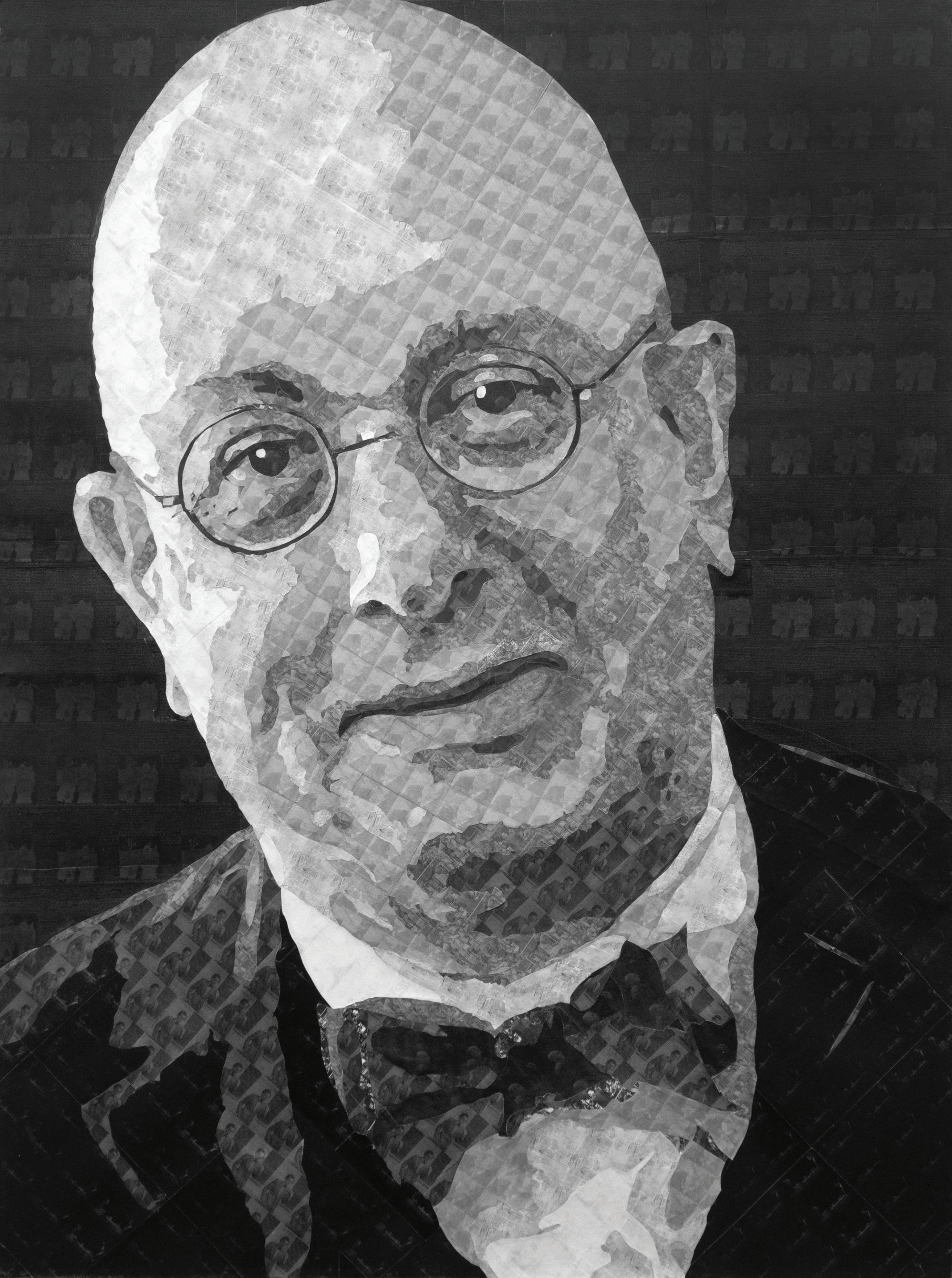 In art, the whole is greater than the sum of its parts. But that doesn’t mean the parts themselves can’t be compelling in their own right. Artist Geoffrey Stein ’82 uses collage to layer text and images, which carry their own separate meanings, over the scaffolding of a drawing. The resulting portrait is literally built on the subject’s attributes, influences, experiences, and accomplishments. Stein calls this approach, “a modern take on the Renaissance tradition of including iconography in portraiture, such as books to signify education or tools to symbolize the subject’s trade or craft. Instead of using symbols, as a Renaissance painter would, I collage these portraits using materials and text from the subject’s environment or the popular press.”