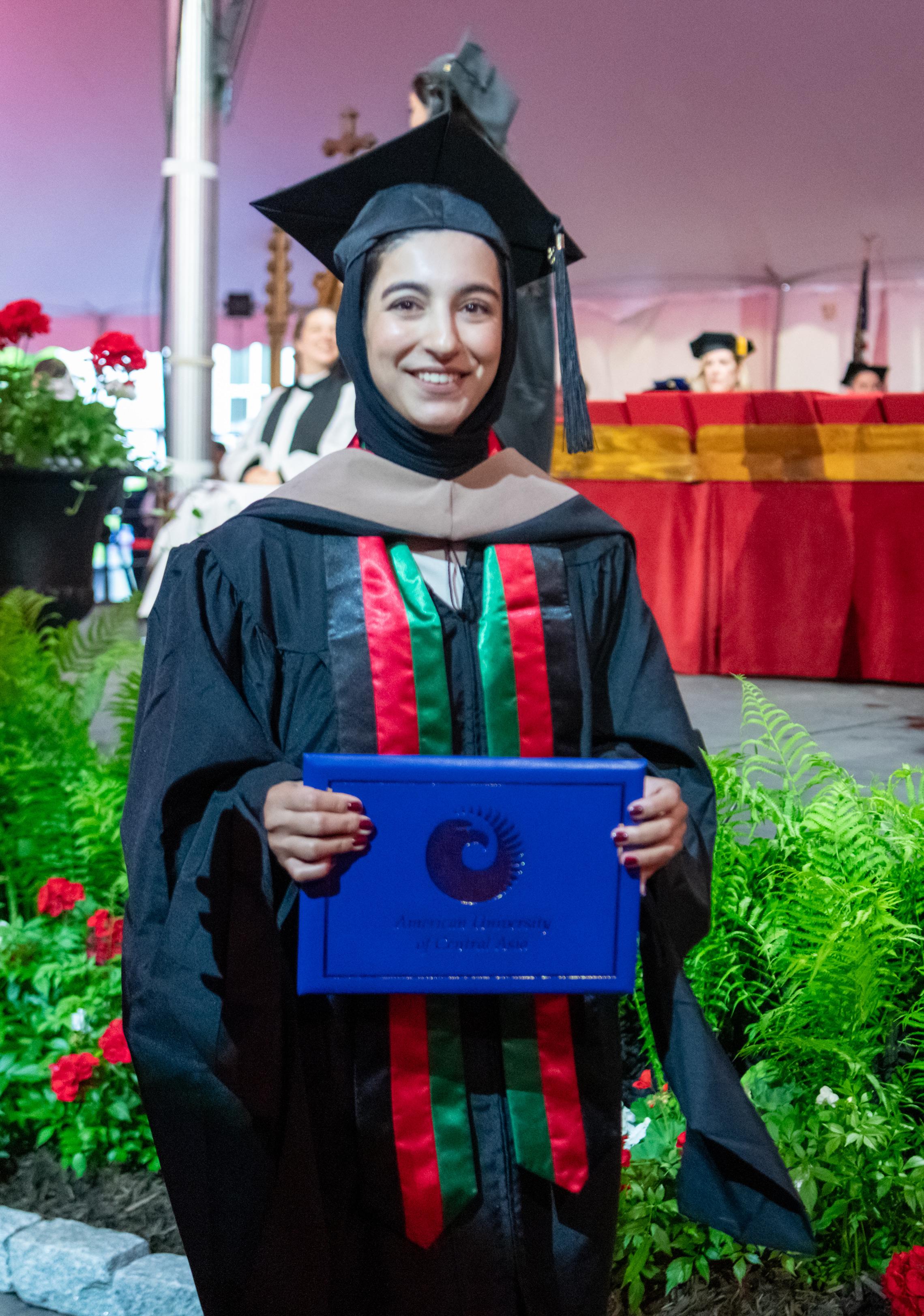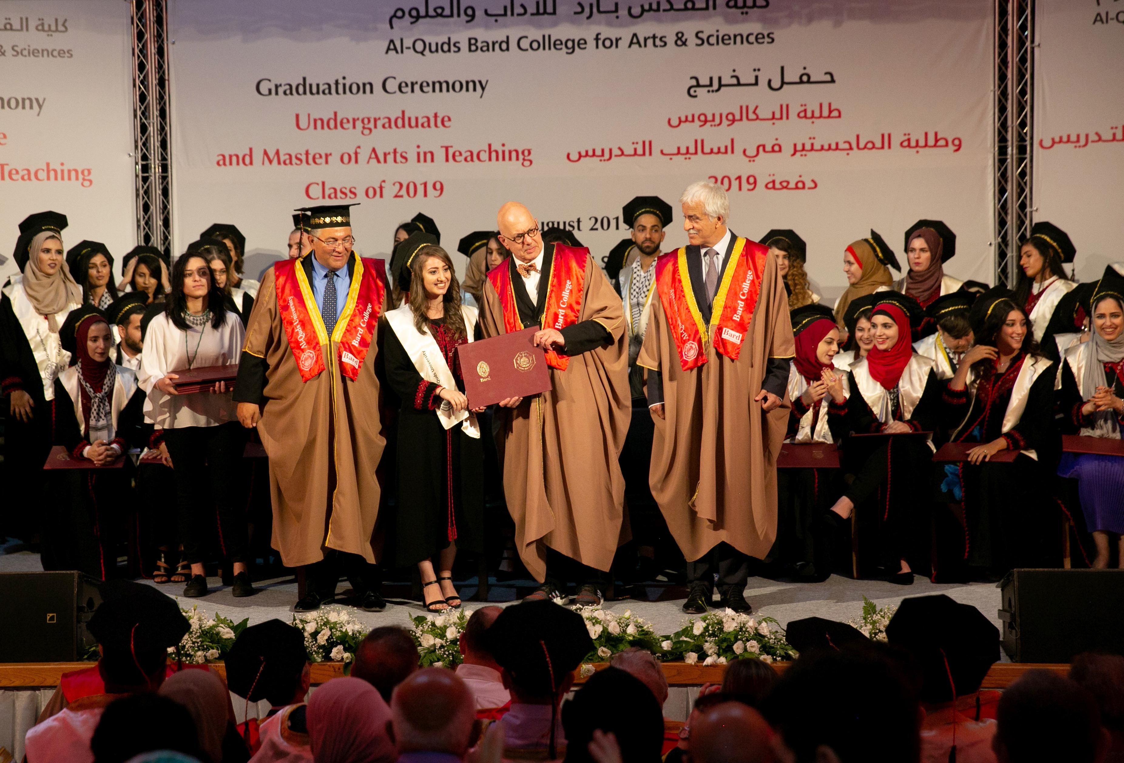 Al-Quds Graduation Ceremony 2019: (front row from left) Imad Abu Kishek, president of Al-Quds University; graduating student; Leon Botstein; and Marwan Awartani, Palestinian minister of education and higher education