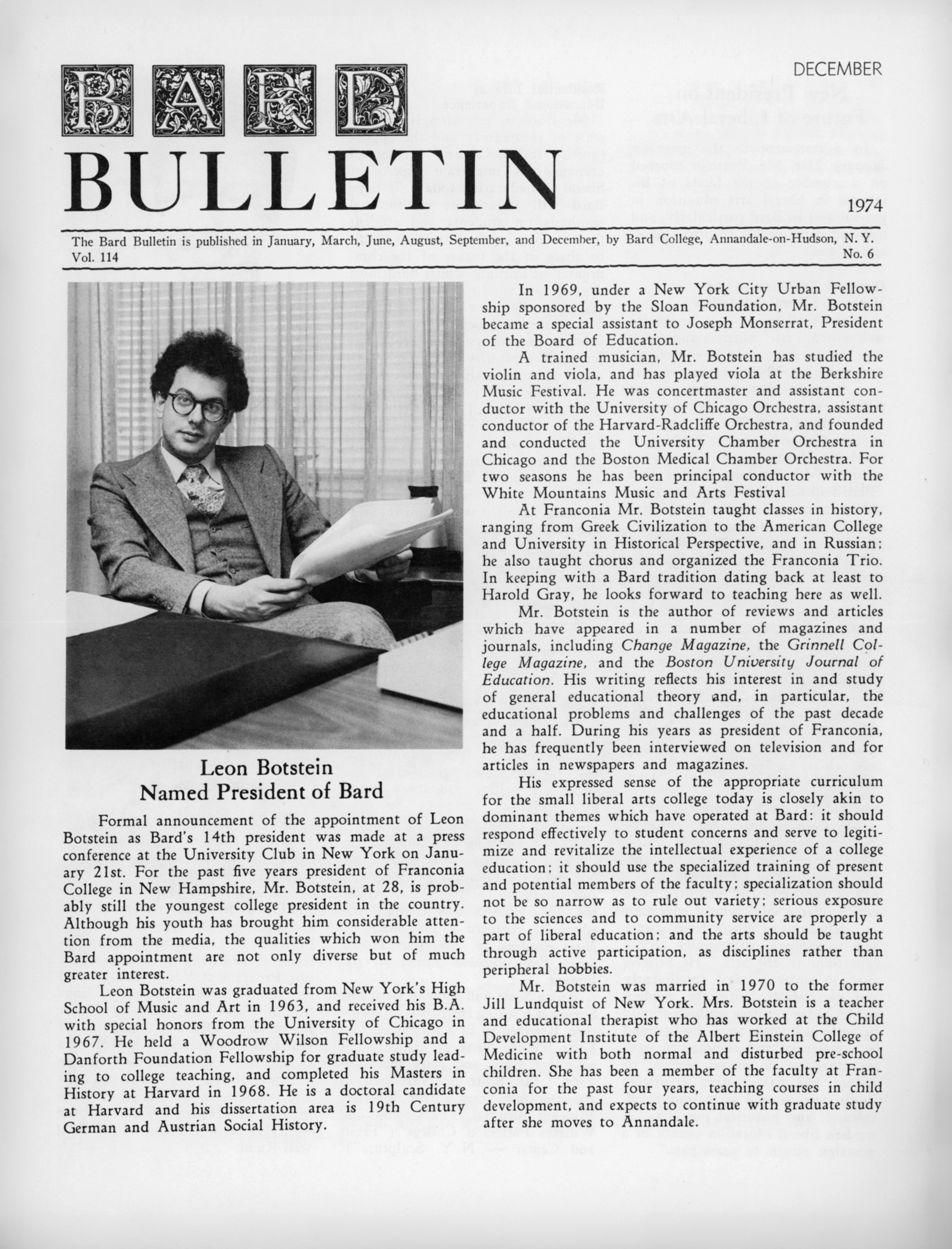 If I were to lay aside my poet’s quill and pick up the rusting machinery from my fiction-writing days to start a novel about a college president, I wonder if any of the true things I would record about Leon Botstein would seem possible? I would have to write about a young man still in his 20s, courageous enough, smart enough, to take on the presidency of a college faltering to its knees; a college that had lost both direction and endowment, a college that needed help. But within a few years, this failing institution would be on its feet, getting larger and larger, and larger and stronger. This would be a man who, despite being a college president would also be a scholar—a man who could teach musical history in Vienna to the Viennese, in German. A man who wrote articles and books, a man who paid attention to the whole intellectual current of the world. Remarkable.