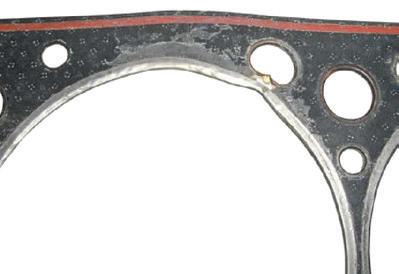 4. Túlmelegedés okozta károsodás: A hengerfejtömítések túlmelegedés okozta károsodását sok esetben egy alkatrész leállása vagy meghibásodása okozza. Ilyen lehet a vízpumpa, egy nem nyíló termosztát, egy vízkőlerakódásoktól eltömődött hűtőkör, elégtelen hűtővíz mennyiség, a kipufogócsatorna keresztmetszetének beszűkülése okozta ellennyomás, vagy szerelési hanyagság. A túlmelegedés jelentős fekete elszíneződésként, a hengerfejtömítés deformálásaként jelentkezik, mely az égési gázok átfúvását teszi lehetővé.