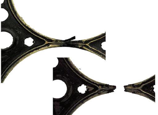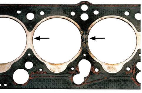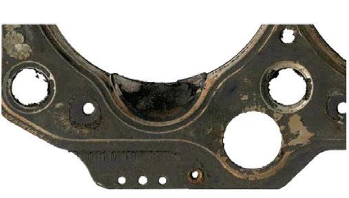 5. Gázkiáramlás okozta károsodás: Az égési gázok kifúvása a hengerfejtömítés olajfuratainál az egyik leggyakoribb ok, ami a hengerfej szétszerelését teszi szükségessé. Az kifúvás egyértemű jele a tömítés fekete elszíneződése, a hűtőkör túlmelegedése, majd hűtővíz forrás, valamint a hengerfej eldeformálódása, mely csak súlyosbítja a hibát. Lehetséges ok a hengerfejtömítés nem zár megfelelően a szereléskor alkalmazott elégtelen meghúzási nyomaték miatt, vagy a régi hengerfejcsavarok lettek újra felhasználva.