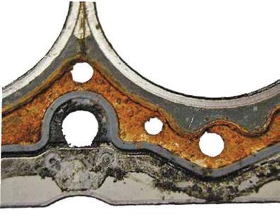 3. Az olaj- és hűtőfolyadékszivárgás okozta károsodás: Az olaj- és hűtőfolyadékszivárgásra vonatkozó panaszokat sok esetben a hengerfejtömítés helytelen beépítése okozta, mely lehet például a motorblokkra történő nem megfelelő pozicionálása, a felület nem kellő mértékű megtisztítása a szennyeződésektől beszerelés előtt, vagy akár a fém-elasztomer hengerfejtömítések elasztomer részeinek túlzott mértékű összenyomódása.
