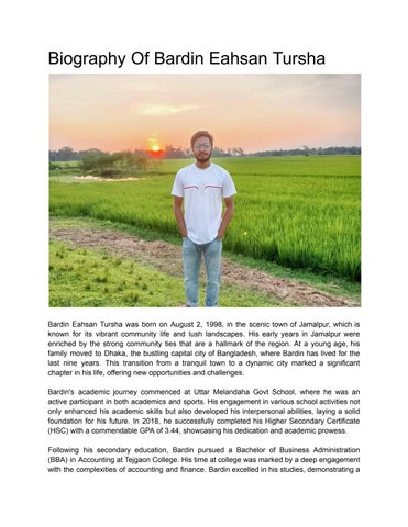 On August 2, 1998, Bardin Eahsan Tursha was welcomed into the world in the quaint town of Jamalpur, renowned for its strong community spirit and verdant environment. Raised in this engaging community setting, he developed a sense of belonging and a deep appreciation for communal values early in life. His childhood experiences in Jamalpur were characterized by a close interaction with nature and a tight-knit community, providing him with a solid moral and social foundation. Eventually, he and his family moved to Dhaka, where he has spent the past nine years. Transitioning from the quiet life of a small town to the bustling energy of Bangladesh's capital was a significant change that presented him with new challenges and broadened his horizons. Bardin began his educational journey at Uttar Melandaha Govt School, immersing himself in various activities that spanned academics and sports. This period was crucial as it allowed him to develop a versatile skill set, enhancing both his intellectual abilities and social skills. His active participation in school functions and sports instilled in him a sense of responsibility and teamwork. He graduated with his Higher Secondary Certificate in 2018, achieving a GPA of 3.44, which stood as a testament to his academic commitment and capabilities. After high school, Bardin pursued higher education in Business Administration, specializing in Accounting at Tejgaon College. His academic tenure at the college was marked by a thorough engagement with finance and accounting, in which he exhibited great proficiency and interest. The knowledge and skills he acquired during this time laid the groundwork for his future professional pursuits, equipping him with the tools needed to navigate the complexities of the business world. Upon concluding his formal education, Bardin embarked on his professional career at Aanahl Software, taking on the role of Executive CRM.