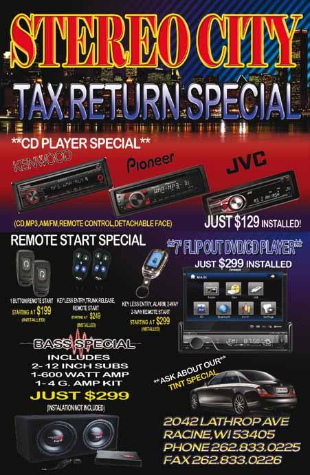 Bargain Hunter 12/2/22 PH 262-639-3050 Email: scottpub@wi.rr.com A Family Owned & Operated Business OPEN 24 HOURS EVERYDAY Call 414-335-7570 We Buy Unwanted, Salvage, Scrap or Damaged Cars/Trucks/Motorcycles instant estimates over the phone or via text 414-335-7570 We pay cash Free pickup/towing Junk Car removal “Se Habla Espanol” 2832 Lathrop Ave Racine • (262) 598-8604 03 Chevy Avalanche.................$2,995 03 Chevy Malibu......................$3,995 07 Hyundai Elantra 5 Pass........$3,995 05 Ford Escape........................$4,695 02 Jeep Liberty 115K...............$4,995 06 Jeep Liberty Renegade.......$4,995 06 Jeep Liberty.......................$4,995 04 Chevy Trail Blazer Ext..........$4,995 08 Dodge Grand Caravan.........$4,995 02 Chevy Tahoe.......................$4,995 03 Hyundai Santa Fe................$5,495 07 Chevy Equinox AWD............$5,495 06 Chevy Equinox LT AWD 111K $5,495 07 Ford Escape........................$5,495 05 Jeep Grand Cherokee..........$5,995 08 Hyundai Entourage.............$5,995 2010 Dodge Nitro....................$5,995 09 Dodge Dakota X-Cab, 86K....$5,995 07 Ford Escape 4WD................$5,995 06 Nissan Path nder...............$6,495 11 Chrysler Town & Country.....$6,495 06 Nissan Path nder...............$6,495 06 Buick Lacerne CXL...............$6,495 11 Chrysler Town & Country.....$6,495 07 Ford Expedition..................$6,995 07 Ford Expedition Eddie Bauer $6,995 08 Dodge Nitro R/T..................$6,995 09 Ford Escape........................$6,995 06 GMC Yukon XL.....................$6,995 04 Chevy Tahoe Z71.................$6,995 09 Ford Escape........................$6,995 05 Chevy Tahoe Z-71................$6,995 09 Chevy Malibu......................$6,995 07 Chevy Equinox LT................$6,995 09 Chevy Equinox 97 Miles.......$6,995 08 Dodge Nitro RT...................$6,995 13 Dodge Grand Caravan.........$7,495 10 Ford Escape........................$7,495 12 Buick Regal........................$7,495 07 Jeep Grand Cherokee..........$7,495 09 Chevy Impala LT..................$7,495 07 Chevy Avalanche.................$7,995 08 Jeep Commander................$7,995 11 Ford Expedition..................$7,995 07 Chevy Tahoe.......................$7,995 11 Ford Expedition..................$7,995 08 Jeep Liberty 116 K..............$7,995 10 Chrysler Town & Country.....$7,995 08 GMC Yukon XL.....................$8,495 08 Chevy Suburban LT.............$9,495 10 Ford F150 X Cab, 4x4...........$9,995 09 Chevy Tahoe.......................$9,995 www.gtmotorsportsracine.com 98% Credit Approval Over 100 Cars & Trucks in Stock for Immediate Delivery *Plus tax, title, license and service fees. GET READY FOR THE SNOW! We Sell SNOW PLOW Replacement Parts Snow Plow Lights Snow Plow Hoses & Fittings Open Daily: Mon. - Fri. 8 - 8 pm, Sat. 8 - 5 pm, Sun. 9 - 1 pm Buy Right Auto Parts (262) 681-1900 4747 Hwy 31 · Racine