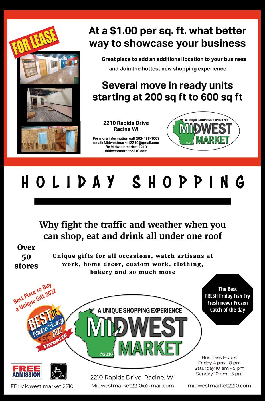 Antiques JENN SMITH www.etsy.com/shop/KonomaKreations2 MidwestMarket@ 2210 Rapids Dr Racine, WI 53404 PRIMITIVE COTTAGE Country Decor & Vintage Finds 2210 Rapids Dr. • Racine, WI Beautiful reconditioned & Repurposed furniture, rag rugs, braided rugs and much more! 262-930-4788 • Handmade Purses • “CTC” Car Trash Can • Coke Collectibles Carol Eberhardy 262-930-3397 ceberhardy@yahoo.com C & J DESIGNS CHERYL GEORGE Pillowcases, Tablerunners and Blankets. Cobblestone Custom Creations 414-349-9327 Wood Plaques, Bird Feeders, Concrete Fire Pits, Table Tops, Address Markets, Pet Gravestones, Memorials and More. JON ERVIN Owner jonervin254@yahoo.com Custom Made Pet Gravestones Racine 2210 Rapids Dr Art Handcraft 262-308-2756 2210 Rapids Dr Racine, WI 53404 Facebook, Instagram, e-Bay BEACH GLASS JEWELRY, DECOR & MORE beckiesbeachshack@yahoo.com Enjoy Your Holiday Shopping Experience at the Midwest Market with Over 50 Shops to visit. Located at 2210 Rapids Drive, Racine, WI Open: Fri 4-8, Sat & Sun 10 - 5 pm