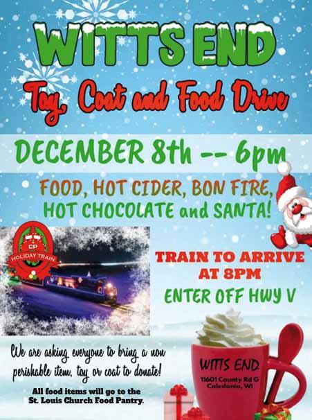 Bargain Hunter 12/2/22 PH 262-639-3050 Email: scottpub@wi.rr.com Fax 262-639-7820 • www.bargainhunterpaper.com 3 and enjoy a nostalgic horse-drawn sleigh ride through our 78-acre apple orchard and woods - a winter wonderland. Enjoy tasty s’mores and hot chocolate or hot cider around a warm camp re. Call 262-884-7100 to make your reservation for a private horse drawn sleigh ride. Reservations are available seven days a week, all winter long (provided we have enough snow coverage). Reservations at 262-884-7100 Pricing for 2022-2023 season is $135 (plus tax) for up to 4 people and $30 (plus tax) per additional person. Bundle up… Great Food with Large Menu Boat Launch Row Boat per day Row Boat with Motor Pontoon Rental Available Live Bait Available Call 262-895-1055 25313 W. Loomis Road • Wind Lake, WI 53185 • (262) 895-1055 Open Daily Open Sunday For Breakfast 8am -Noon Enjoy Our New Patio with Lake Views Drinks • Prime Rib Fri-Sun · Fri Fish Fry *Raise Money for your Organization dates still available for Ice Fishing Jamborees. Upcoming Ice Fishing Jamborees Wind Lake Lion's Club January 21st 2023 All Jamboree Tickets are available for sale at Sportsman's Pub & Grub Wind Lake Fireworks January 28th 2023 Milwaukee Casting & Sportsmen's Club February 4th 2023 Country Rose Bakery & Cafe “Homemade Boxed Assorted Christmas Cookies" 19319 Washington Ave Union Grove, WI (262) 878-5474 Christmas Eve at The Rose SaturdayDecember24th Open6am-1pm ServingaVery SpecialBreakfast MenuOnly countryrosebakery.com Open: Wednesday - Saturday 6 am - 2 pm, Closed Sundays & Mondays & Tuesday