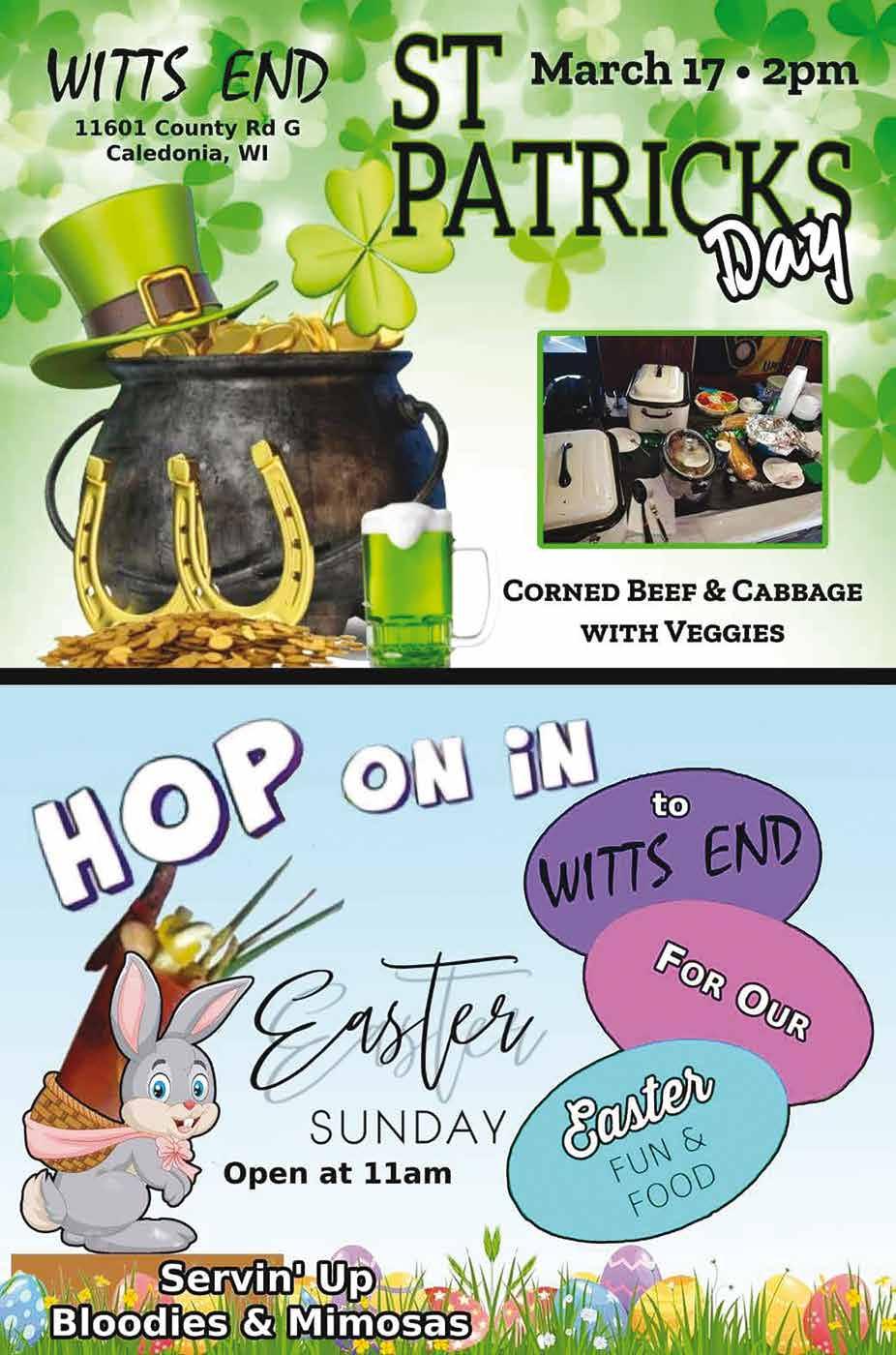 Bargain Hunter 3/1/24 PH 262-639-3050 Email: jeff@bhpapers.com Fax 262-639-7820 • www.bhpapers.com 5 Phone: (262) 748-1428 1830 - 27th Avenue • Kenosha Monday - Sunday 7am - 9 pm Website: www.MoodysSubsAndSweets.com • Moody Cheesesteak • Pastrami • Reuben • Shawarma • Falafel • Meatball Bomber • Chicken Sandwich • Chicken Pesto • Leonardo Da Veggie • Mama Mia • Hercules Ask About Our Gift Certi cate Special $40 Adults $20 Children Full Menu at summitrestaurant.com 10 & Under 3 & Under FREE EASTER CHAMPAGNE BRUNCH THE SUMMIT RESTAURANT HWY 20 MOUNT PLEASANT 262•886•9866 SUMMITRESTAURANT.COM 19319 Washington Ave • Union Grove, WI • (262) 878-5474 Country Rose Bakery & Cafe "Come in and taste what we’re cooking up for St Patricks Day" Happy St. Patrick’s Day www.countryrosebakery.com Open: Tuesday - Saturday 6 am - 2 pm, Closed Sundays & Mondays 7002 - 30th Avenue • Kenosha, Wisconsin Great Food, Great People and Family Friendly Our Hall is Available for Parties, Reception, Events, Meeting and Any Other Occasions (262) 654-9810 For rent information call Open 7 Days a Week Bar Hours Mon-Thurs 2:00 until Close Fri, Sat, Sun 12:00 until Close Thank You Racine For Voting Us BEST HAMBURGER KEWPEE LUNCH MENU Monday-Saturday 8-5, Closed Sunday • Breakfast served until 10 am daily Place an order for pickup 634-9601 • We do not accept internet or fax orders. FOOD BEVERAGES Hamburger.................$2.75 Cheeseburger.............$3.10 Double Hamburger....$5.10 Double Cheeseburger.$5.45 Fish Sandwich............$4.75 Fish w/cheese............$5.10 Hand Dipped Shakes..$3.65 Hand Dipped Malts....$3.80 Racine is the birth place of malted milk Coke Products Regular Size...............$1.25 Quart Size..................$2.80 Homemade Root Beer Regular Size...............$1.40 Quart Size..................$2.80 Root Beer Float..........$3.15 Co ee or Tea...............$1.25 Hot Chocolate.............$1.75 Milk............................$1.55 Homemade Chili Bowl of Chili........$3.80 Cup of Chili..........$2.60 Chicken Filet Sandwich........$4.95 Toasted Cheese Sandwich....$2.20 French Fries..........................$2.25 Potato Chips...........................$.75 520 WISCONSIN AVENUE (262) 634-9601 Our beef is ground fresh daily and then hand pattied and pressed. Single burgers approx. 1/6 lb. of beef before cooking. Double burgers approx. 1/3 lb, of beef before cooking 1 1/2 lbs. Brats 3 lbs. Ham 2 lbs. Bacon 2 lbs. Pork Steak 2 lbs. Lean Beef Stew 2 lbs. T-Bone Steaks 9 lbs. Chuck Roast 6 lbs. Rump Roast 2 lbs. Beef Tenderloin 25 lbs. Lean Ground Beef 15 lbs. Cut-up Chicken 4 Cornish Hens (22oz.) 3 lbs. Boneless Chicken Breast 12 lb. Turkey 6 lbs. Pork Chops 6 lbs. Pork Loin Roast 6 lbs. Pork Steak 2 lbs. Pork Chop Suey 2 lbs. Lean Bacon 6 lbs. Smoked Ham 6 lbs. Chicken 3 lbs. Rump Roast 3 lbs. Pot Roast 1 1/2 lbs. Beef Stew 5 lbs. Pork Chops 5 lbs. Country Pork Ribs 12 lbs. Lean Ground Beef Cut, Freezer Wrapped & Flash Frozen FREEZER MEAT SPECIAL $249.95 TAX REFUND SPECIAL $619.95 Ground Beef Patties 1/4 or 1/3 lb. 6# Box $37.99 10# Box $59.90 Your Choice - $37.99 6# Box • Mushroom Steak Patties • Bratwurst Patties • Cheddar Brat Patties • Chicken Patties • Pizza Burgers St. Patrick’s Specials Corned Beef Rounds Market Price Corned Beef Brisket Market Price Famous Homemade Corned Beef Get Ready for March Madness Open Face Sandwich Tray Hye Roller Trays • BBQ Riblets BBQ Chicken Wings Swedish Meatballs • Sloppy Joe BBQ Meatballs • Taco Dip Tray Deviled Egg Tray 6900 Highway 31 (262) 639-5828 Mon-Sat 9am - 5 pm, Closed Sunday & Holidays