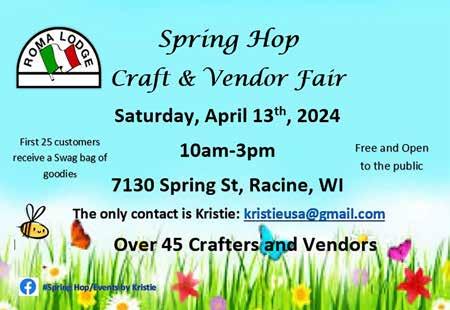 6 Bargain Hunter 3/1/24 PH 262-639-3050 Email: jeff@bhpapers.com Fax 262-639-7820 • www.bhpapers.com 2131 N. Main St. Racine, WI 53402 262.636.9189 racinezoo.org LEARN MORE AT RACINEZOO.ORG AT RACINE ZOO INCLUDED WITH ZOO ADMISSION FREE FOR ZOO MEMBERS Cluck-Cluck Door Hunt Trunk Hunt $5 Easter Bunny Photo Creature Features Cookie decorating Egg decorating Bounce Houses SATURDAY, MARCH 30, 2024 | RACINE ZOO What does a snowman like to eat for breakfast? Frosted Flakes A++ A ordable Dog Training Basic and Advanced Obedience Classes Conformation Classes Call for Classes Kenosha Kennel Club is a Non-Profit Organization dedicated to the betterment of Dogs in Society. www.kenoshakennelclub.org Call (262) 657-1422 Senior, Military & Dog Rescue Discount The Best For Less... www.kenoshakennelclub.org AKC S.T.A.R. Puppy GIFT CERTIFICATES AVAILABLE Now Air Conditioned SWEDISH PANCAKES & SAUSAGE BREAKFAST Swedish American Club Kenosha, WI 7002 30th Ave 8:00 am - 12:00 pm SUNDAY, APRIL 7th, 2024 Tickets at the door or in advance