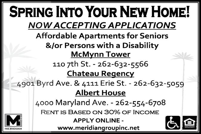 12 Bargain Hunter 3/1/24 PH 262-639-3050 Email: jeff@bhpapers.com Fax 262-639-7820 • www.bhpapers.com SAFE STOR STORAGE FACILITIES 3100 98th St. Sturtevant, Wis. 53177 Please call 262-886-9898 or 262-383-5717 Call For Availablility! 5x10’s $90 $45 Security Deposit 10x10’s $100 $50 Security Deposit 10x15’s $110 $55 Security Deposit 10x20’s $120 $60 Security Deposit Locks and keys are provided, paved driveways for easy access, and cameras in place for security! Ask for Bob or Robin who have owned/operated and managed the sheds for 11 years! Jeanne's Tax Service Jean Gorsiski - 1400 Harmony Dr Office 262-639-6293 • Cell# 262-939-6295 e-mail: jtax@wi.rr.com • Same Day Service • Computerized • Small Business • Individual Tax • Notary 4200 North Main Street Racine, WI 53402 • (262) 639-7900 1 Bedroom starting at $1000 2 Bedroom starting at $1180 Our 1 & 2 Apartments MakeYou Feel LIke You’re in a Resort! • Heat & Water Included • Indoor & Outdoor Swimming Pool • Fitness Center, Whirlpool, Tennis Courts, & Community Room • Same Floor Laundry & Storage • Garages Available • Cats Welcome “Judge each day not by the harvest you reap but by the seeds you plant”