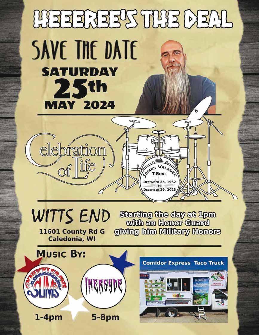 WPS Tree Service Call 414-622-0032 Celebra�ng 37 Years! Oak Creek, Caledonia, South Milwaukee, Cudahy, Franklin & Hales Corners 2023 Media Kit We Will Make You Famous! $10.00 OFF Mulch Delivery of 12 Yards or More With coupon. Excludes Sale Items. Not valid with other o ers. Expires 5/30/24 $5.00 OFF Mulch Delivery of 6 Yards or More With coupon. Excludes Sale Items. Not valid with other o ers. Expires 5/30/24 $3.00 OFF Pick-up of 3 Yards or More With coupon. Excludes Sale Items. Not valid with other o ers. Expires 5/30/24 (414) 769-9663 The Melvin Mulch Company Family Owned and Operated for over 30 Years The Melvin Mulch Company 240 E. College Avenue Next to 440th AFB, by Airport Yard: 414-856-9077 • O ce: 414-769-9663 www.MelvinMulch.com • White Cedar • Hemlock Mulch • Celock™ Mulch • Eastern & Western Red Cedar Mulch • Bark Mulch • Premium Oak Bark Mulch • Playground Chips • Colored Hardwood Mulch: Red, Gold, Dark Brown, Light Brown, Black • Top Soil & Decorative Stone MAY 12, 2024 ADULT $35 MEMBER $45 NON-MEMBER CHILD $25 M E M B E R $35 NON-MEMBER 2 YEARS & YOUNGER: FREE • CATERED BRUNCH • GIRAFFE ENCOUNTER • FLOWER FOR MOM • COMMEMORATIVE PHOTO • GENERAL ADMISSION TO THE ZOO! SATURDAY MAY 18 SAMPLE A BLOODY MARY FROM EACH PARTICIPATING COMPETITOR VOTE FOR THE BEST BLOODY MARY LIVE ENTERTAINMENT $40 GENERAL ADMISSION $25 NON-DRINKING ADMISSION BUY TICKETS AT RACINEZOO.ORG