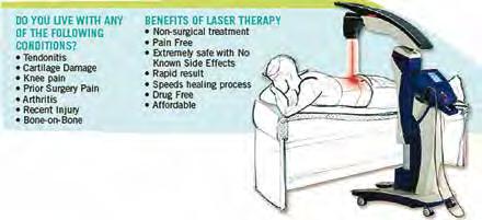 MLS Laser Therapy is an e ective, painless treatment for all types of pain relief that has been cleared by the FDA and proven successful as evidenced by extensive and credible research studies conducted in our country's nest institutions, including Harvard Medical School. Our laser is a dual-wave synchronized fully robotic MLS Laser. Our laser uses speci c wavelengths of light that have a strong anti-in ammatory, anti-edema e ect on tissues that are exposed to the laser. As a result of the MLS Laser, the cells of tendons, ligaments and muscles repair themselves faster. In simple terms, laser energy kick-starts the healing process, thereby speeding recovery. No matter if you have long standing pain from prior surgery, injury, arthritis, or you have a new injury MLS Laser Therapy has been proven to work.