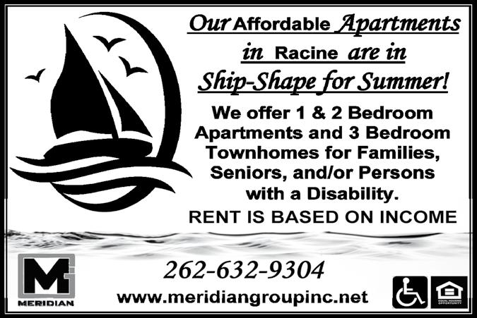Bargain Hunter 6/7/24 PH 262-639-3050 Email: jeff@bhpapers.com Fax 262-639-7820 • www.bhpapers.com 11 The Summer Market is Here! For information contact our o ce at 262-554-0380 email: carol@signatureteamrealtors.com List for Less List with Carol Hawes Signature Team Ask About Our Special Listing Program for your Home or Condo. 4% Total Real Estate Commission No additional fees Professional Photos 3 month contract term. BENEFITS: We provide two valuation methods, so you'll know you are priced right. Save Thousands of Dollars Call Carol Hawes Today and get an appointment with our Team to be the rst to hit the summer market. Waiting Lists Are OPEN! 1 and 2 Bedroom units! Rent is based on income for those who have a physical disability and who are of low income. Please call St. Clare Mgmt. at 414-385-5330 for more information. 6800 Middle Rd. Racine 2 Bedrooms $995 637 S. Greenbay Road, Racine Owner: John W. Rogowski JR PROPERTIES Call (262) 653-9132 2409 - 52nd St., Suite 3 • Kenosha Heat Included!! Lighthouse Point Townhomes TOWNHOME AMENITIES (262) 639-1160 All tenants will have access to: UNIT FEATURES Each unit featues: Rents Starting $1,100 www.lighthousepointtownhomes.com 3 Bedroom Townhouses Open Mon.-Fri. 9-5, Sat. 10am- 2 pm Walk-Ins Welcome Rents Starting $1,200 Monday through Friday 9 a.m. to 5 p.m. Walk-Ins Welcome 4200 North Main Street Racine, WI 53402 • (262) 639-7900 1 Bedroom starting at $1000 2 Bedroom starting at $1180 Our 1 & 2 Apartments MakeYou Feel LIke You’re in a Resort! • Heat & Water Included • Indoor & Outdoor Swimming Pool • Fitness Center, Whirlpool, Tennis Courts, & Community Room • Same Floor Laundry & Storage • Garages Available • Cats Welcome “What you get by achieving your goals is not as important as what you become by achieving your goals.”