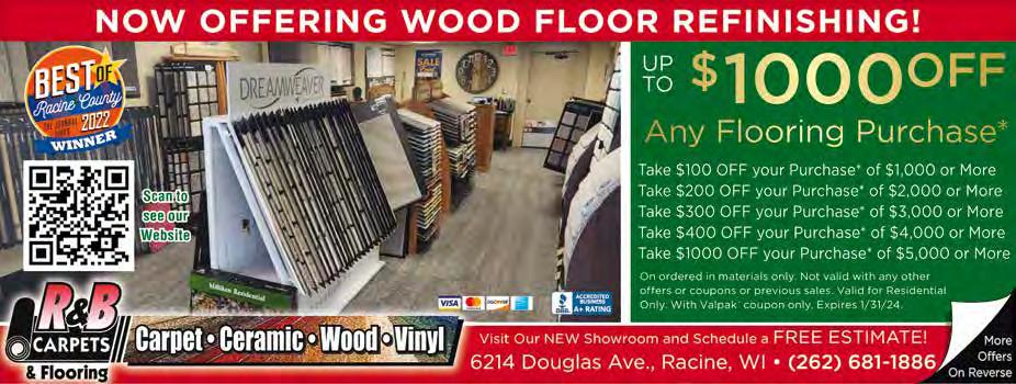 Bargain Hunter 6/7/24 PH 262-639-3050 Email: jeff@bhpapers.com Fax 262-639-7820 • www.bhpapers.com 17 FREE Estimates (262) 237-2869 www.roofsruswi.com Roof Installation & Repairs ~ Siding ~ So t, Fascia & Gutters Licensed & Insured R-K Carpet Upholstery & Duct Summer Cleaning Special 2 Rooms just $109 • 3 Rooms just $149 5 Rooms just $209 Pet Spot Deodorizing • Furniture Moving Included • Flexible Scheduling • Empty Home Discount Kenosha (262) 652-6445 Cleaning www.rkcarpetcleaning.com $389 Air Duct Cleaning 15 Vents Dryer Vent Cleaning Available Take $100 OFF your Purchase* of $1,000 or More Take $200 OFF your Purchase* of $2,000 or More Take $300 OFF your Purchase* of $3,000 or More Take $400 OFF your Purchase* of $4,000 or More Take $1000 OFF your Purchase* of $5,000 or More On ordered in materials only. Not valid with any other o ers or coupons or previous sales. Valid for Residential Only. With Bargain Hunter coupon only. Expires 7/31/24. Visit Our NEW Showroom and Schedule a FREE ESTIMATE! 6214 Douglas Ave., Racine, WI • (262) 681-1886