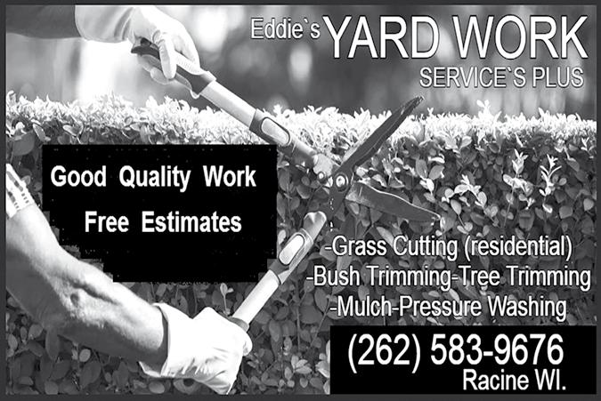 In observance of the Juneteenth Day Holiday, City of Racine solid waste and recycling will not be collected on Wednesday, June 19, 2024. This holiday will rotate your collection day as per the calendar below We Are Approved by: Our Job is to Make Your Home as Beautiful as this Home..... This Is What We Do WINDOWS • SIDING • GUTTERS ROOFING • REMODELING Call for your Free Estimate Today! (414) 488-0630 I am Not Joking!!! 2 months or more Full Color $25 extra This Ad Cost $80 Call (262) 639-3050 Becker’s Tree & Landscaping Services • Tree Removals • Tree Trimmings • Storm Damage • Tree & Shrub Planting • Brick Patios • Walkways • Stump Grinding • Mulch • Tree Cabling www.beckerslandscaping.com Veteran Owned • Insured • Free Estimates Of Pleasant Prairie, WI Located in Kenosha (262) 612-0404 Now is the time to remove dead wood Strong
