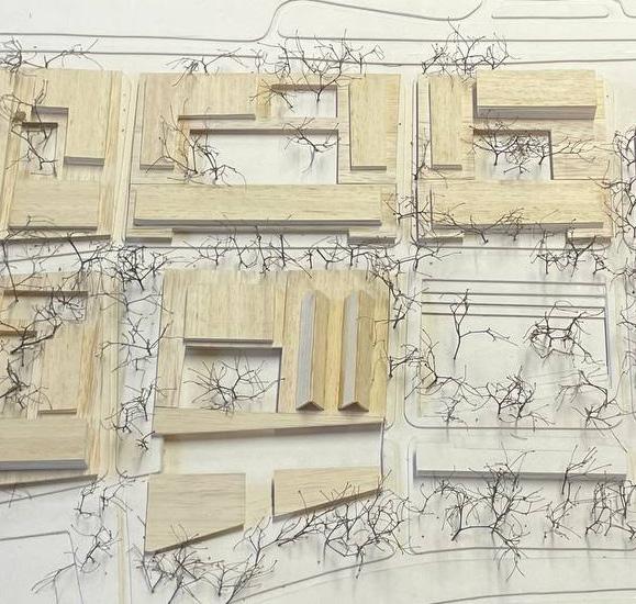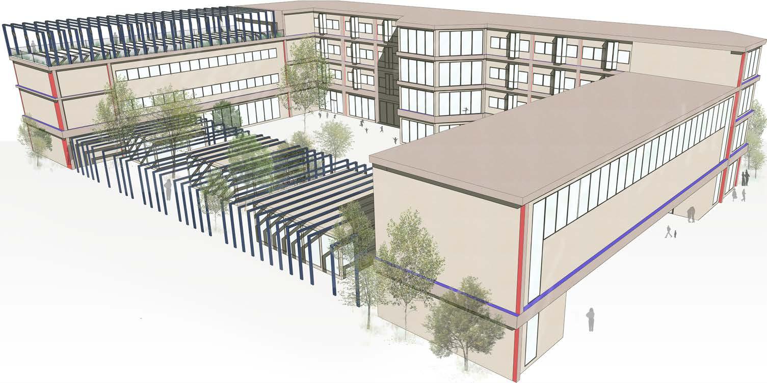 Our proposal enables a grid structure that the public flux is arranged within, hence the modular timber pillars and beams that hold the roof structures are arranged accordingly, creating a continuous pathway. The roofs have massive impact on the urban outlay, creating courtyards that aim to generate community areas for specific educational units.
