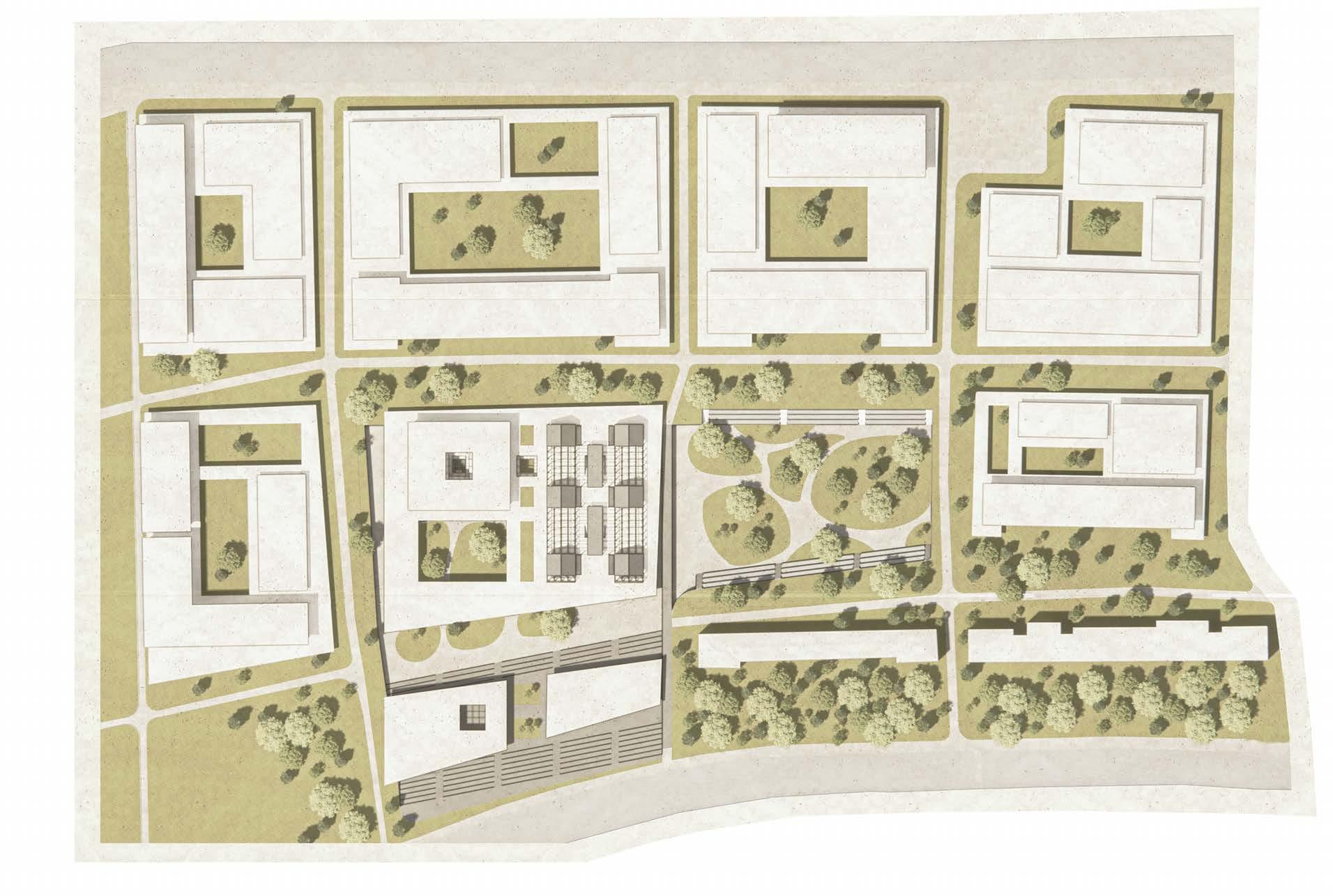 Our proposal includes the refurbishment of the landscape and a variation of room modules that aim to facilitate the flux of necessary functions. The design consists of 3 main courtyards, each with a particular color: Red one in brick, creating a warm and secluded space; blue highlighting the health facilities on the ground floor in addition to water functions while the green one to connect with the surrounding natural environment. By creating modular and connected courtyards, the goal is to create a private neighborhood that also reflects the courtyard typology of Milanese architecture.