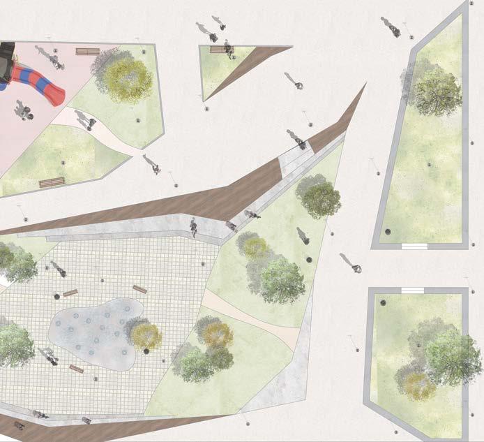 The journey from the courtyard to the public space requires a smooth transition, adided by the shared street and the park design that extends till the interconnected pathways. Thereby enabling a fluid flux and community spaces for the pedestrians.