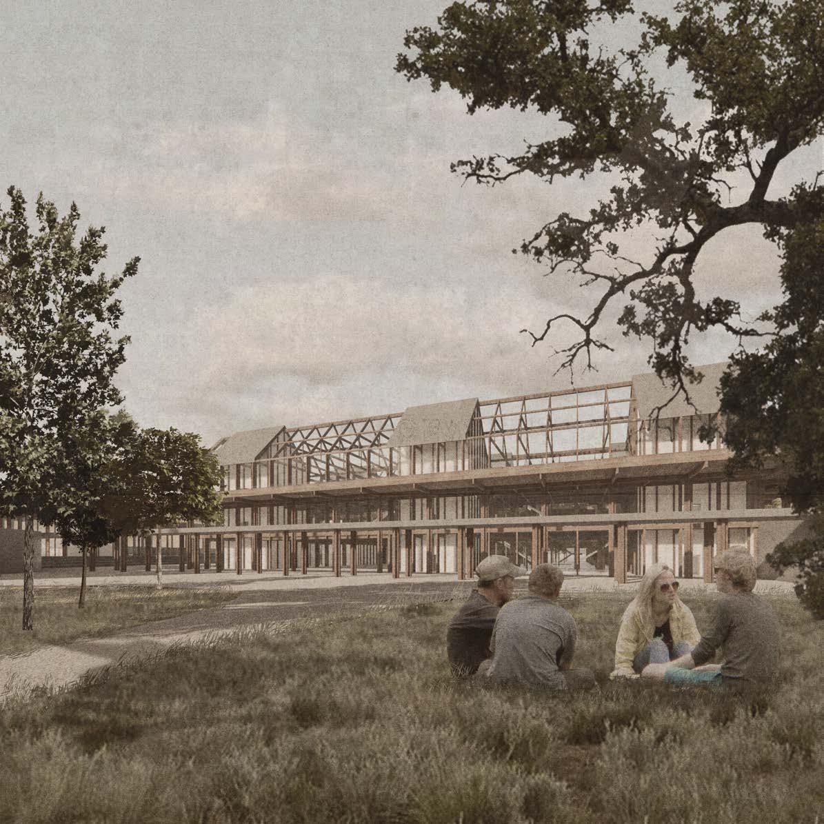 military barracks that existed before. The stylistic choice is inspired by the traditional Bosnian housing style, combining wooden structures with simplistic facade design.