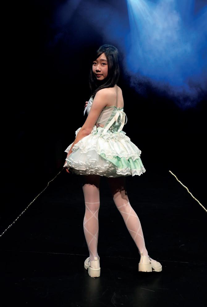 Amilia’s Major Textiles Project is a two-piece costume that blends the whimsical elegance of modern Japanese Lolita fashion with the ornate detailing of the Rococo era. The ensemble features a structured corset paired with a short, quadruplelayered ruffle skirt, creating a playful yet refined silhouette.