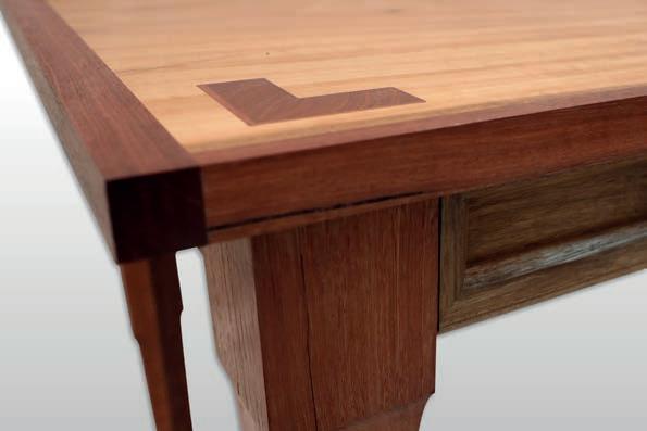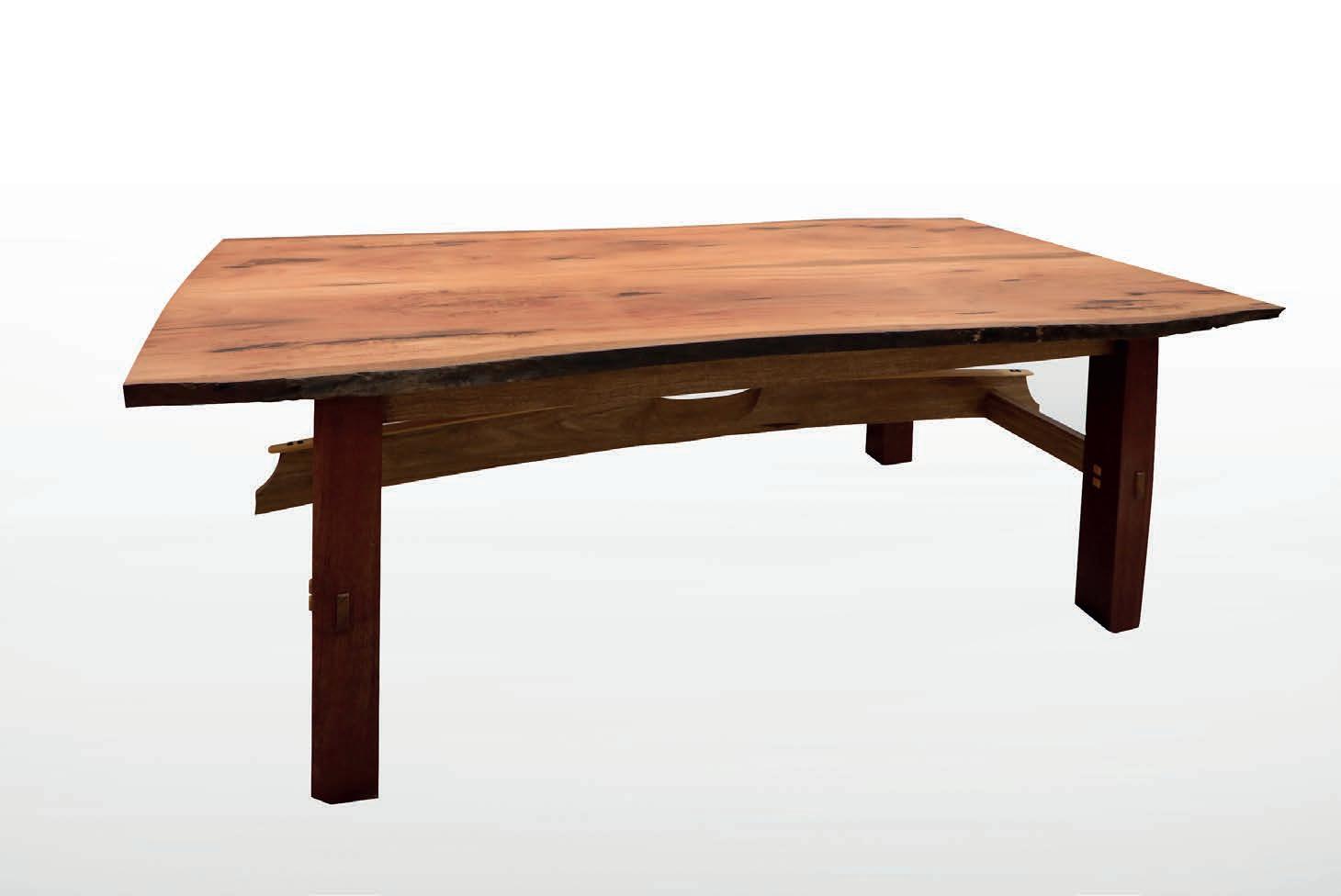 rail, creating visual unity and flow. The lower rail form draws inspiration from Japanese katana swords, incorporating elegant curvature and strength. Edge cross halving joints and false tenons are used on the rail to further unify the design and reinforce structural integrity. This project demonstrates a deep appreciation for material selection, joinery precision, and aesthetic balance. The combination of native timbers and Japanese design principles results in a table that is both functional and sculptural - an ideal expression of advanced woodworking.