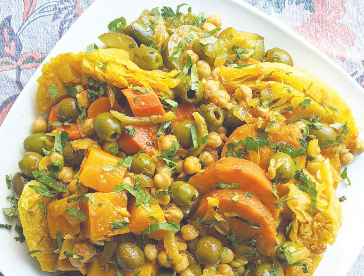 As soon as the tagine starts to simmer, reduce heat to low and let cook undisturbed until the vegetables are almost tender, about 25 to 30 minutes. Add the chickpeas, olives and remaining lemon. Add a little more stock or hot water if the pot looks dry. Cover and continue to cook for another 10 to 15 minutes.