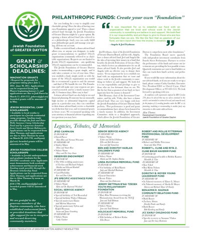 › Request for proposals for programs taking place July 1, 2014 - June 30, 2015. Applications can be requested from Jodi Phares beginning January 2, and applications are due to Jodi Pares by March 15. (610-5513, jphares@jfgd.net) Awarded grants will be announced in May. JEWISH RESIDENTIAL CAMP SCHOLARSHIPS › Available to local youths to participate in a Jewish residential camp program. Funding made possible through the Joan and Peter Wells Summer Camp Scholarship Fund and by a generous donation from Carole and Bernie Rabinowitz. Applications can be requested from Alisa Thomas, and applications are due to Alisa Thomas by noon on March 28. (610-1796, anelligan@ jfgd.net) Awarded grants will be announced in May. JEWISH FOUNDATION COLLEGE SCHOLARSHIPS › Available to Jewish undergraduate and graduate students for the 2014/2015 academic year. Applicants must demonstrate both academic achievement and financial need. Funding made possible through the Heuman Scholarship Fund. Applications can be requested from Alisa Thomas, and applications are due to Alisa Thomas by noon on March 28.