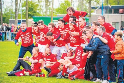 uren om de eerste dorst te lessen en het speciale ‘huldigingsplein’ met tap en tent stond vol met spelers van Rhoon, Pernis en wederzijdse supporters. Ondertussen werd de ‘platte kar’ in gereedheid gebracht voor een rondrit door de gemeente. Voorafgegaan door