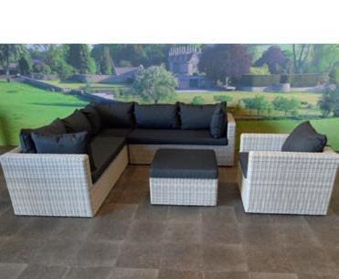 Loungeset Ramiro. Hoekopstelling met tafel, inclusief kussens, afmeting 195 x 260 cm. 1199.- 799.-
