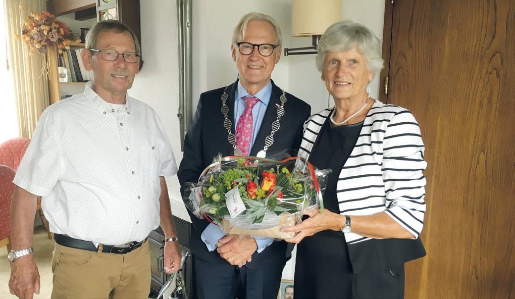 RHOON - Waarnemend burgemeester Jan Pieter Lokker heeft donderdag 28 juli Herman en Alie van den Berg uit Rhoon namens de gemeente Albrandswaard gefeliciteerd met hun 55-jarig huwelijk en hen daarbij een bloemetje aangeboden.
