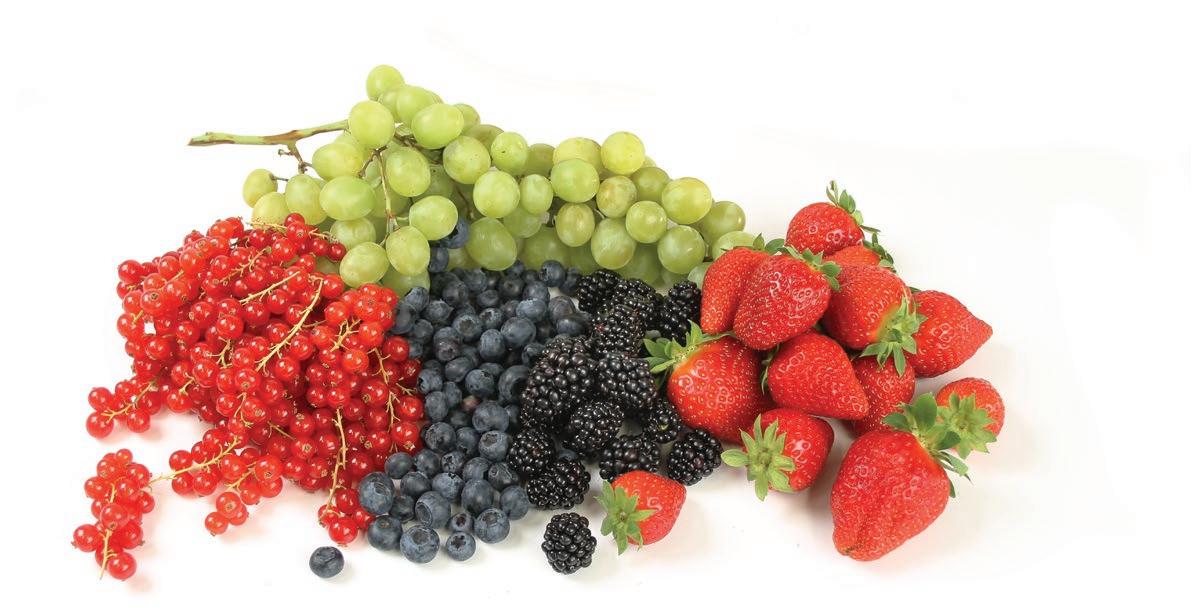 blauwe bessen, bramen (bakje 125 gram), aardbeien (bak 400 gram), rode bessen (bak 300 gram) of pitloze witte druiven (bak 500 gram)