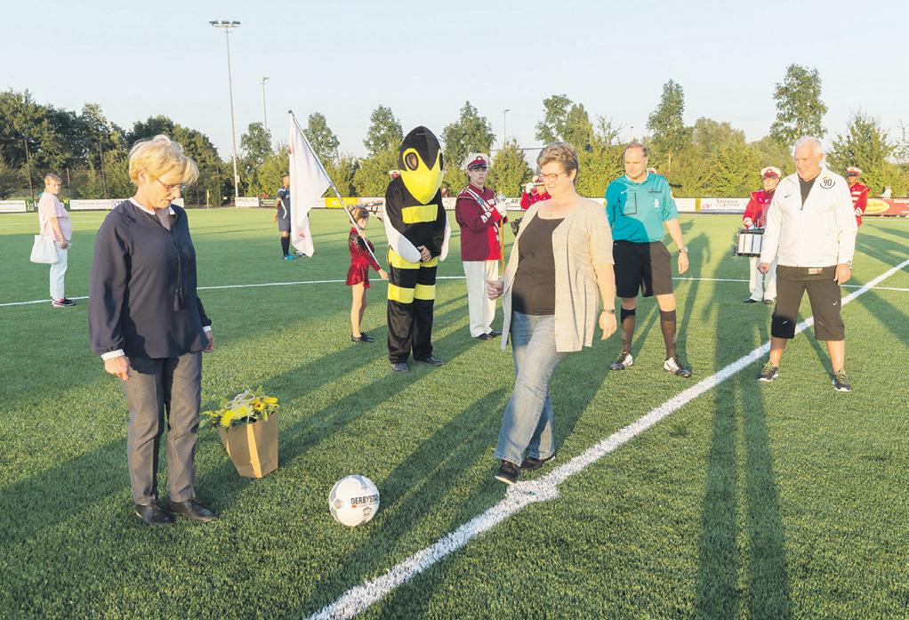 Wethouder Maret Rombout verrichtte de aftrap van de eerste officiële voetbalwedstrijd tussen de selecties van Oude Maas en Poortugaal (zo).
