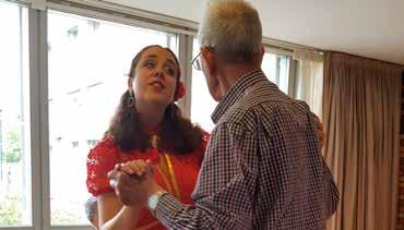 tige rode jurk met bijpassende schoenen en danste al zingend rond de bewoners. Eén bewoner waagde het zelfs een dansje met haar te maken, wat hem heel goed afging. Het was een mooie muzikale beleving met verrassende interacties voor de bewoners van verschillende afdelingen van De Elf Ranken.
