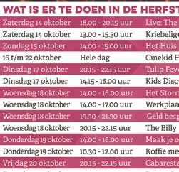 Op zaterdag 14 oktober zal de Barendrechtse band The Fusion optreden. Op dinsdag 17 oktober vindt er tussen 14 en 16 uur een Kruispunt Kids Disco plaats met de prinses Assepoester. De kinderen zijn dan van harte welkom om te komen dansen op prinsen- en prinsessenmuziek. Op woensdag 18 oktober geeft de Barendrechtse Tante T. vanaf 14 uur een improvisatieworkshop voor kinderen vanaf 6 jaar. Deze workshop staat volledig in het teken van de herfst en heet: ‘Het stormt in Het Kruispunt’. Op donderdag 19 oktober gaan de kinderen creatief aan de slag met het maken van eigen Fluffy Glitter slijm. Deze workshop start eveneens om 14 uur. Op vrijdag 20 oktober en zaterdag 21 oktober treden DJ Edward en DJ Perry op. Alle activiteiten zijn gratis toegankelijk en aanmelden is niet verplicht. Belangrijk is wel om op tijd te komen. Het Kruispunt is te vinden aan de Middenbaan 111.