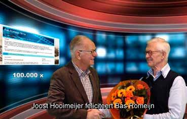 het tot 96 stuks aangegroeide aantal films te zitten. Voor Joost Hooimeijer, die het grootste aantal filmpjes heeft aangeleverd, was deze mijlpaal aanleiding om hem met een bos bloemen in de Hooimeijerkleur te feliciteren. Daarbij vertelde Bas dat hij hoopt dat hij nog lang nieuwe filmpjes kan maken en in een tempo van twee per maand te publiceren op basromeijnfilms.blogspot.nl. Daarmee wordt dit jaar de honderd filmpjes gepasseerd. Voor het komende halfjaar staan genoeg filmpjes klaar. Voor daarna hoopt Bas dat men op zoek blijft naar oude filmbeelden die hij kan bewerken.