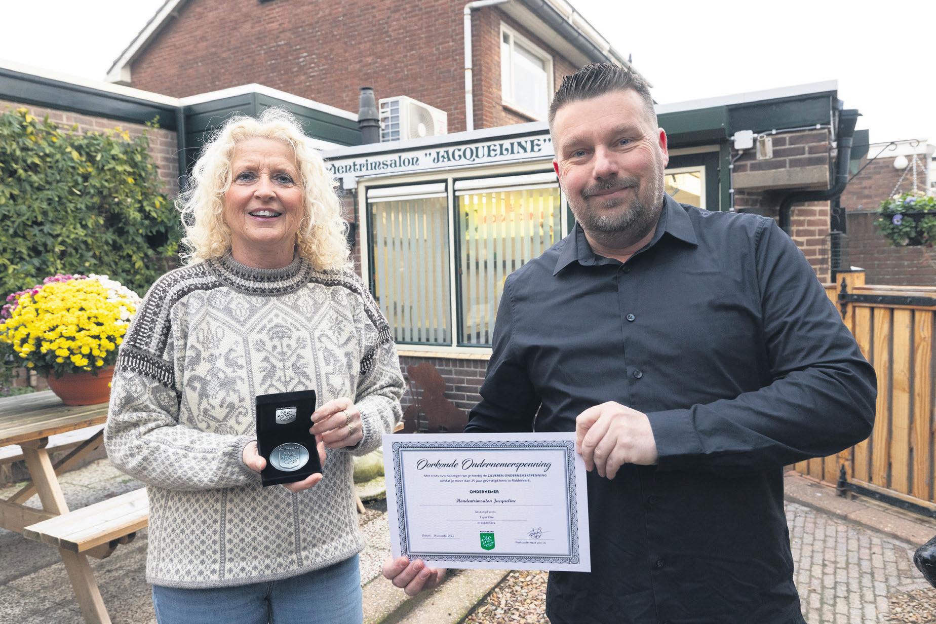 Jacqueline van Os van Hondentrimsalon Jacqueline kreeg vorige week woensdag de zilveren ondernemerspenning uit handen van wethouder Henk van Os.