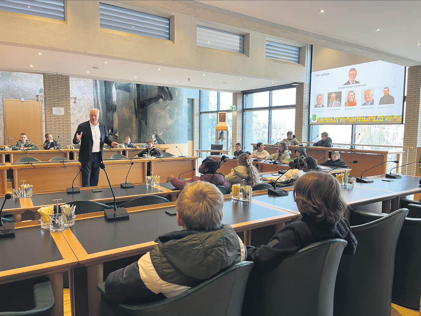 de burgemeester. Vervolgens gingen ze met de wethouder naar de raadzaal. Zo kregen de leerlingen een beeld van hoe het gemeentehuis eruitziet en welke functies er binnen de gemeente zijn. In de raadzaal mochten de leerlingen op de plaatsen van raadsleden, wethouders en de burgemeester zitten. Wethouder Piena vertelde daar wat het werk van een wethouder inhoudt. Hij gaf ook uitleg over de politieke partijen en hoe het gemeentebestuur besluiten