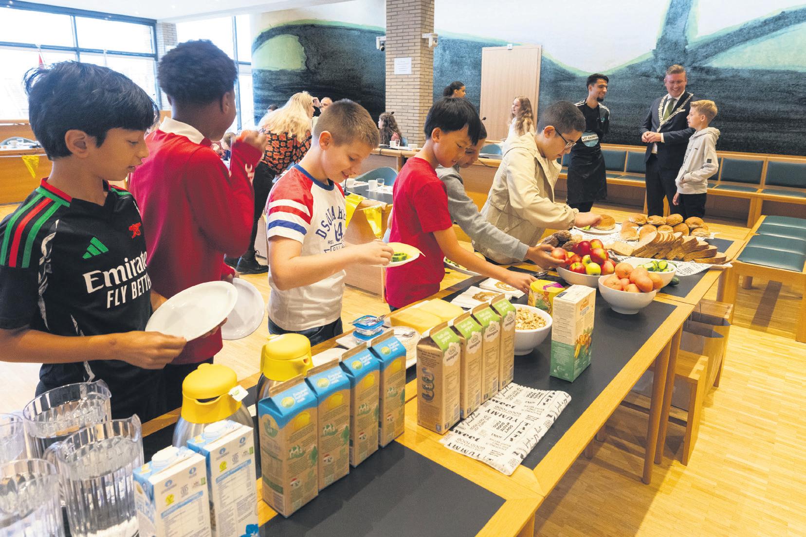 Leerlingen pakken een lekker, voedzaam ontbijt. Rechts op de achtergrond burgemeester Oosterwijk en kinderburgemeester Lucas.