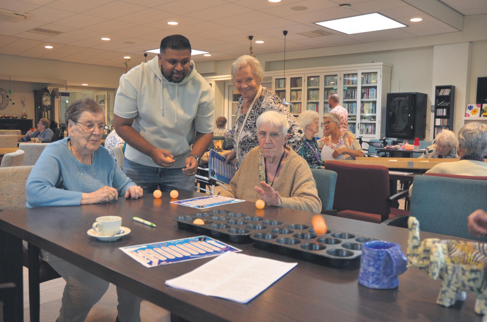 Boven: in het Waalbos hielpen de medewerkers met snoeien. Onder: bij Reyerheem werd geholpen bij de spelletjesmiddag.