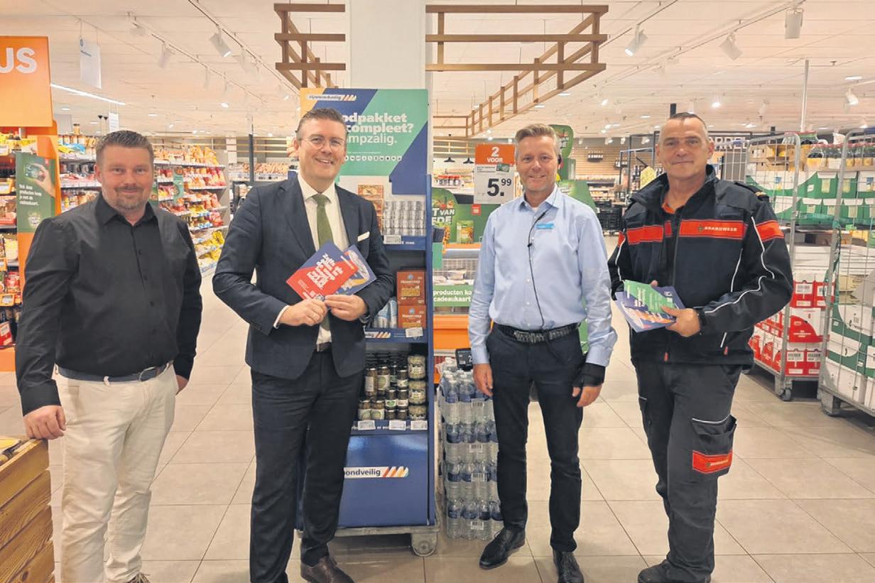 V.l.n.r.: wethouder Henk van Os, burgemeester Marco Oosterwijk, Erik Tupker (Versafdelingsmanager Albert Heijn) en wijkbrandweerman Martin Bouman bij het display van RijnmondVeilig.