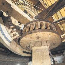 achterkant in. Het ijzer met reuzel, hout met gesmolten bijenwas. Die tandwielen zijn fascinerend: ieder tandje komt een keer tegen een ander tandje ertegenover aan.” Daarboven is de derde zolder, de kapzolder. De kap draait met houten rollen over de stenen romp zodat de wieken in de wind kunnen staan.