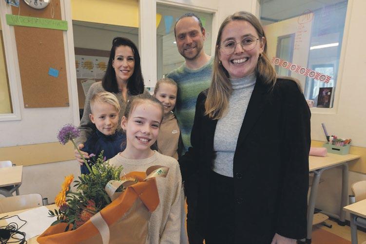 Wethouder Stip (rechts) verraste Lisa in de klas. Haar ouders, broer Jaxx en zus Tirze waren ook aanwezig.