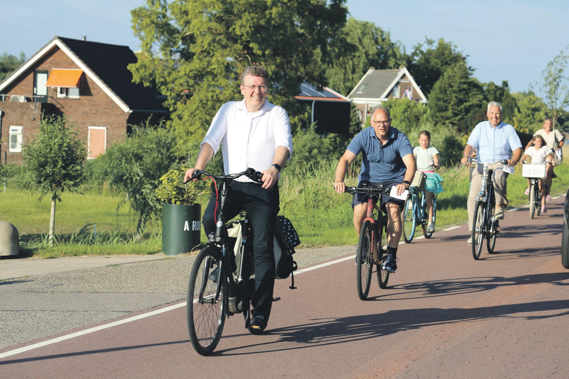 Burgemeester Oosterwijk en wethouders Van der Duijn Schouten en Overheid fietsten op woensdag een etappe mee. Foto: Leen Kruithof