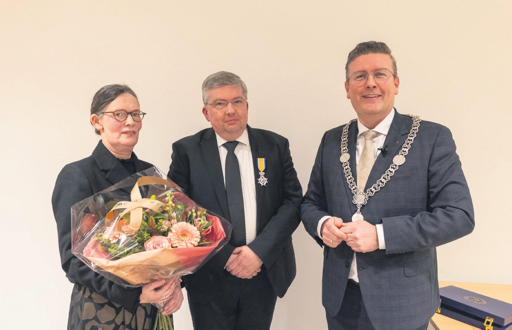 Decorandus Johan Goudswaard (midden) met zijn vrouw en burgemeester Marco Oosterwijk.