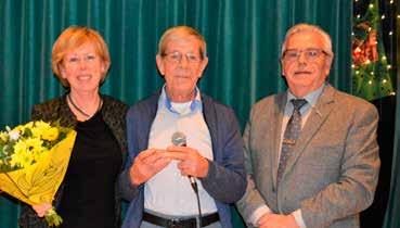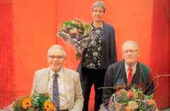 links) werd gehuldigd voor zijn 25-jarig lidmaatschap en erelid en oud-voorzitter Arie de Kluijver (op foto rechts) werd in de bloemen gezet voor 60 Harmoniejaren.