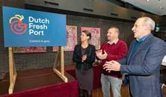 Tanja de Jonge, Henk van Os en Gerrit van Gelder bij het logo van Dutch Fresh Port