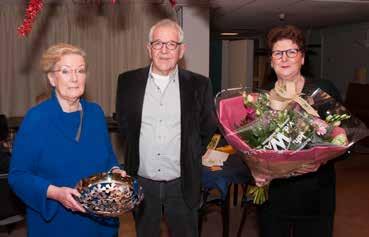 trad hij toe tot het bestuur. Op 30 november 2018 werd er op eigen verzoek een punt achter gezet. De voorzitter probeerde hem nog over te halen om de 40 jaar vol te maken, maar het besluit van zijn vicevoorzitter stond vast. “Het wordt tijd om dit aan jongeren mensen over te dragen” vindt de 78-jarige Kroos, die ook meer tijd wil hebben voor de zorg voor zijn vrouw. Helemaal stoppen bij de club doet hij beslist niet. Pleun wil nog wel zijn steentje bijdragen aan activiteiten die georganiseerd worden door het O.N.A. (Ontspanning Na Arbeid) team van de speeltuinvereniging. Een tweede boeket bloemen stond klaar voor Alie van der Vlis, die bijna vijf jaar de vereniging als penningmeester uit de brand heeft geholpen. Ze deed al de financiën voor de Wandelgroep Oostendam en trad tot het bestuur toe na het plotse overlijden van penningmeester Cees de Vroed. Ook zij stopt niet helemaal, want ze blijft actief voor de wandelafdeling.