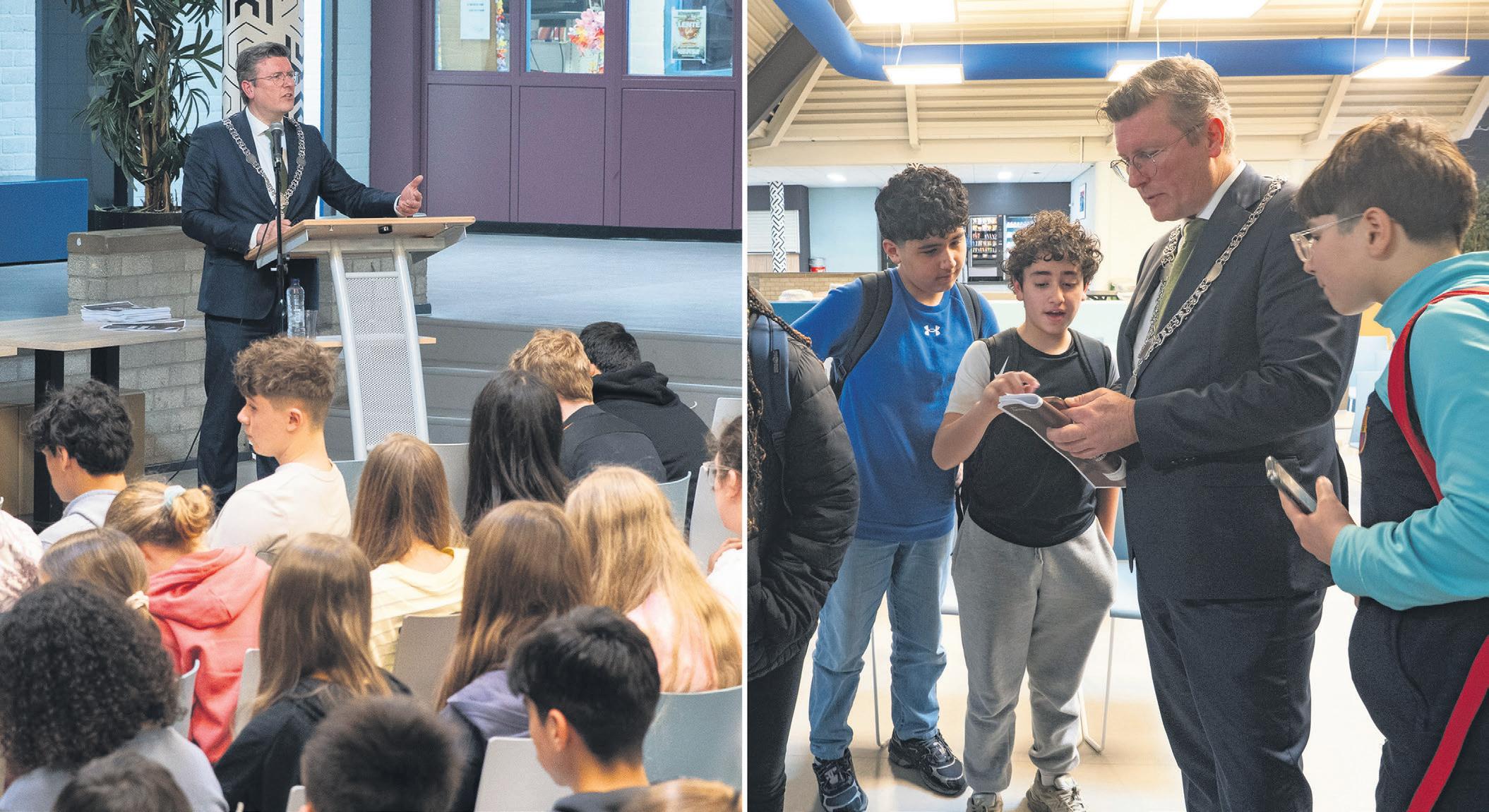 Links: burgemeester Marco Oosterwijk geeft een gastles. Rechts: de burgemeester met leerlingen in