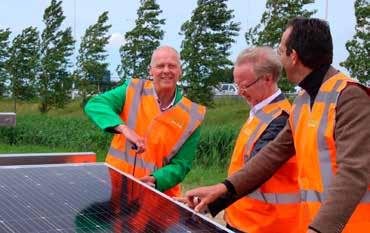 ALBRANDSWAARD - Vorige week gaven wethouder Marco Goedknegt van de gemeente Albrandswaard, Frits Lakemeier de Rotterdamse Energie Coöperatie en Roland Pechtold van GroenLeven het startsein voor de bouw zonnepark Rhoon. Gezamenlijk legden zij het eerste paneel.