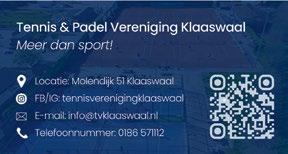 Bij T.V. Klaaswaal bouwen we aan een toekomstbestendige en bruisende vereniging voor de hele Hoeksche Waard en omstreken. Onze missie? Een sociale, sportieve en duurzame omgeving creëren waar iedereen - van jong tot oud - zich welkom voelt. Met betaalbare lidmaatschappen en laagdrempelige activiteiten maken we tennis en padel toegankelijk voor iedereen.